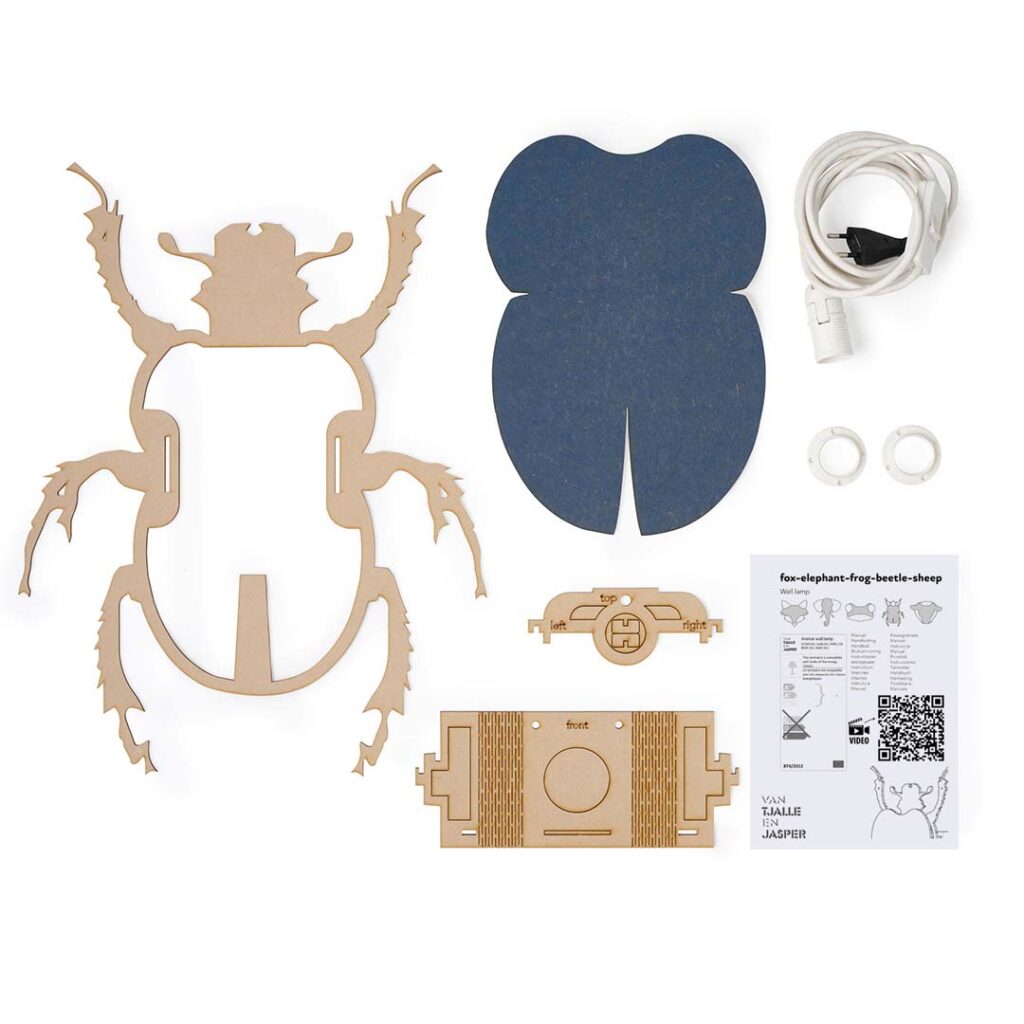 De kever wandlamp wordt geleverd als een handig doe-het-zelf bouwpakket. In de doos vind je alle benodigde onderdelen en een duidelijke handleiding. De montage is eenvoudig en duurt slechts enkele minuten. **Let op: de lichtbron wordt niet meegeleverd.** Wij adviseren een energiezuinige LED-lichtbron.Geef je interieur een uniek accent met de kever wandlamp